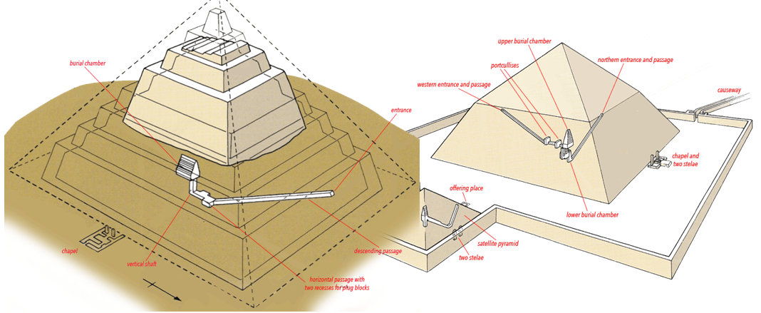الصورة التالية بتوضح التدريج في مكان غرفه الدفن خلال الثلاث اهرامات .....بالتدريج تم بناء الغرفه والممرات داخل الهرم نفسه.